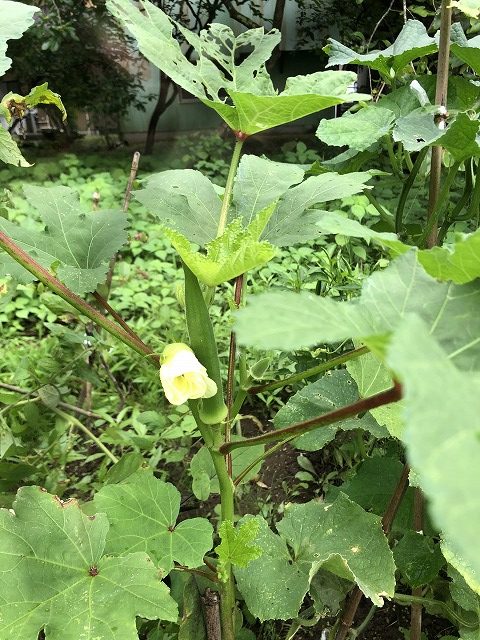 畑に白い大きな花が咲いていたら、それはオクラですー。
