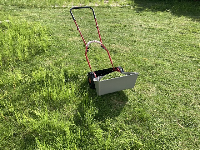 手動芝刈り機、15分で汗だく。「